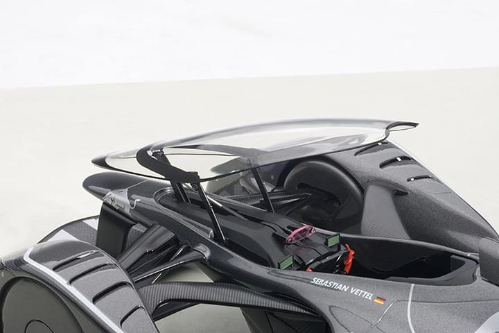 Thanks to the composite body, detail is surprisingly sharp. AUTOart notes they use a special ABS mix for the body panels, then a metal inner frame for rigidity. This pays off: you can see crisp panel lines, tiny door seams, and realistic brake calipers behind the big wheels. The canopy (cockpit cover) opens – another authentic touch – revealing the black interior. Most decals and vents line up well, and even the engine intake details on the rear are clearly molded. The only nitpick is some of the smallest trim (like tiny switches on the dash) is a bit overpainted, but at 1:18 scale that’s forgiveable. Overall it nails the X2014’s complex shape.